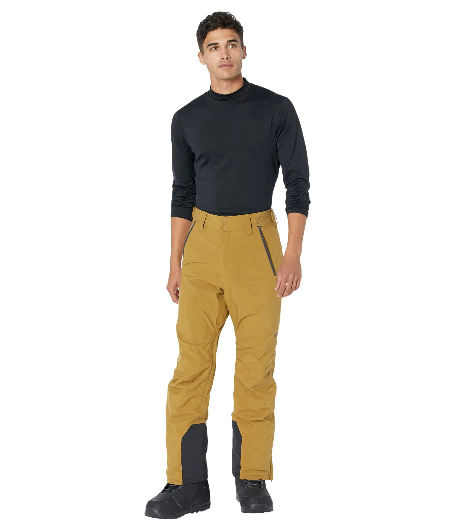 - Regular fit snow pant sits on waist with a medium rise for a comfortable and supportive fit. Straight fit through thigh and tailored at the knee for a clean and modern feel.