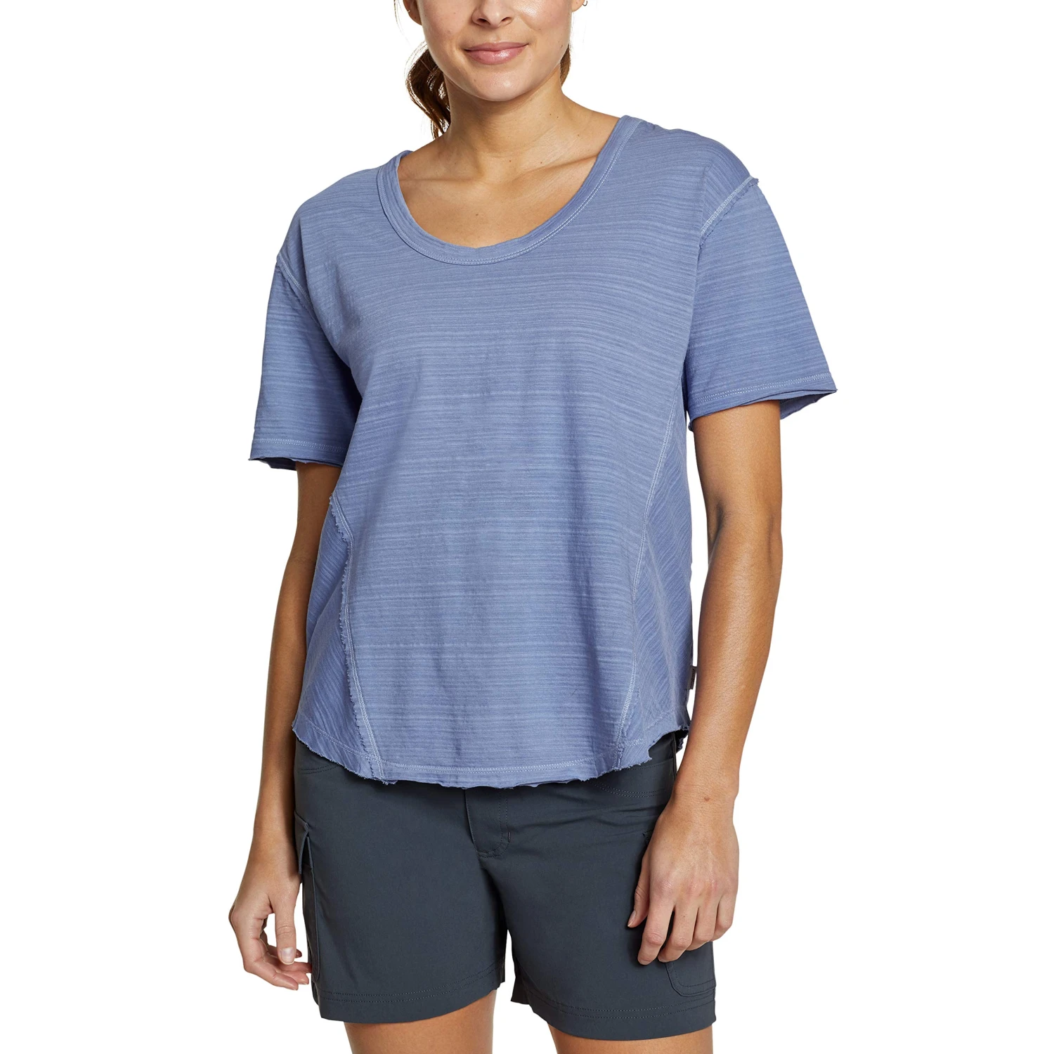 - The Eddie Bauer® Adventure Elbow U-Neck Tee shirt is crafted from a breathable and moisture-wicking fabric that is both soft and garment-dyed for rich color.