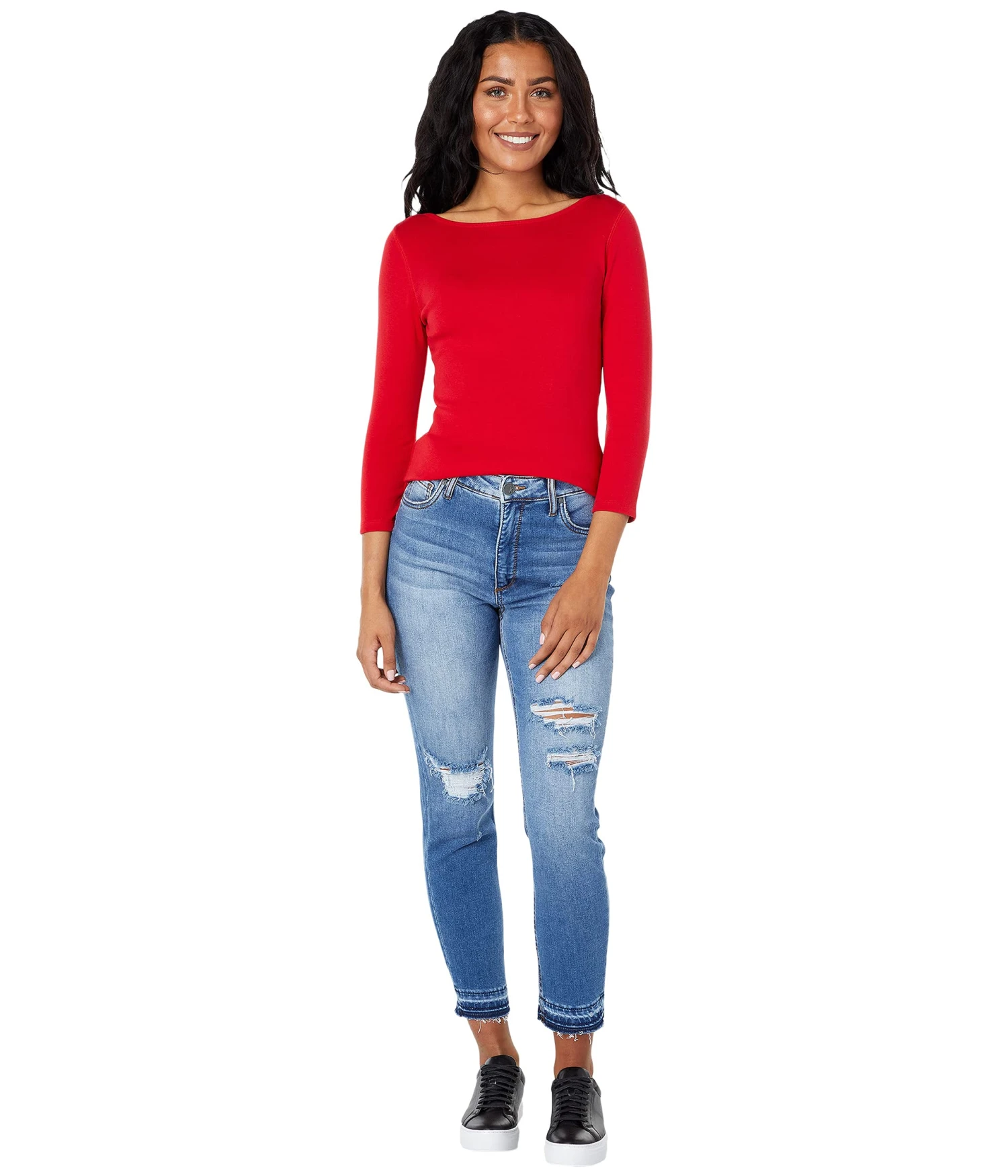 - Pullover shirt boasts a boat neckline and three-quarter sleeves.