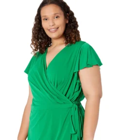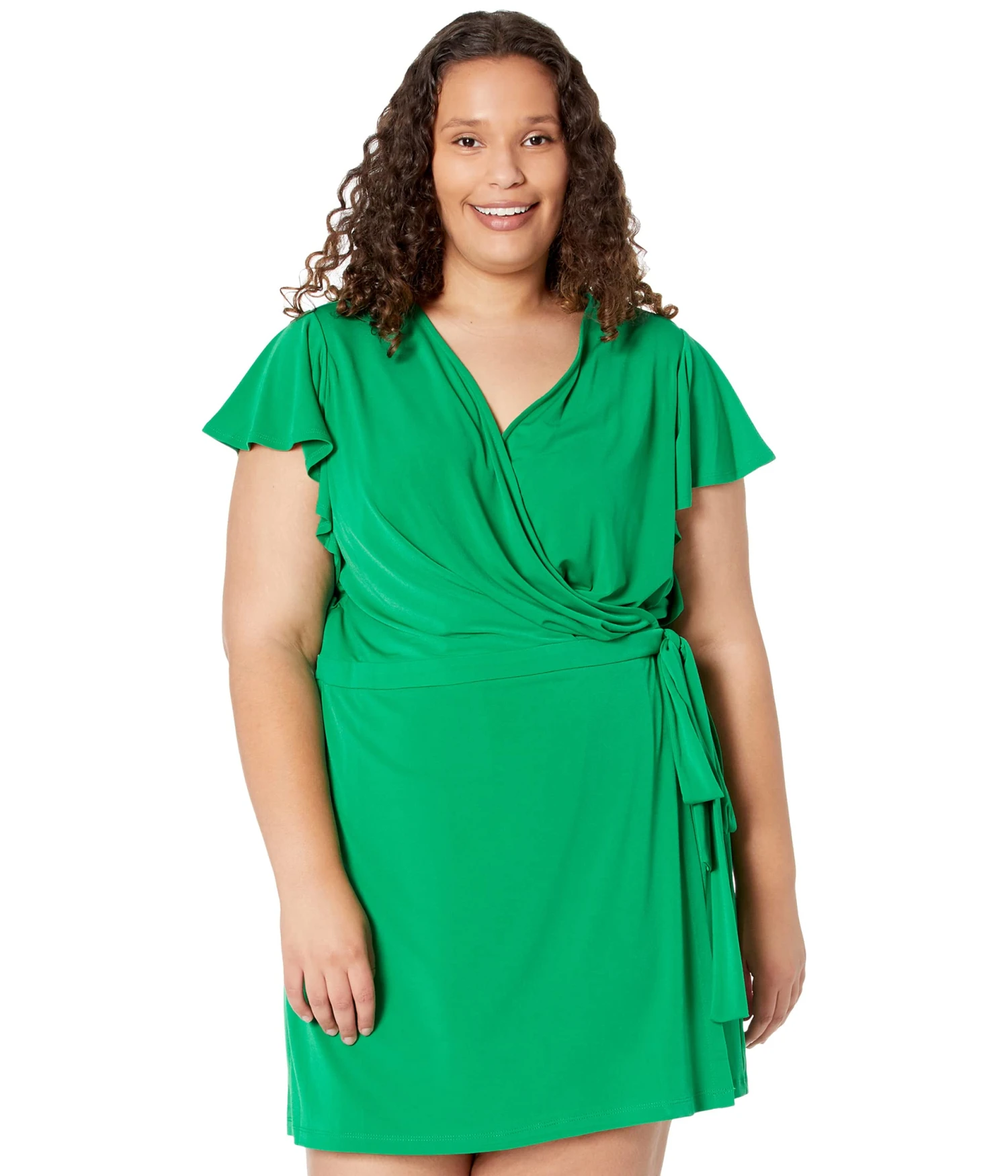 London Times™ Plus Size Solid Jersey Ruffle Sleeve Wrap Short Romper. - SKU: #9582537