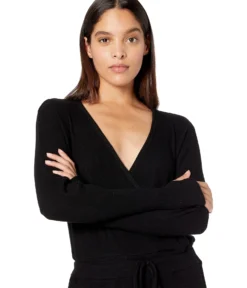 - Plunging wrap-style surplice V-neckline and long sleeves, defined waist, and straight-leg fit.
