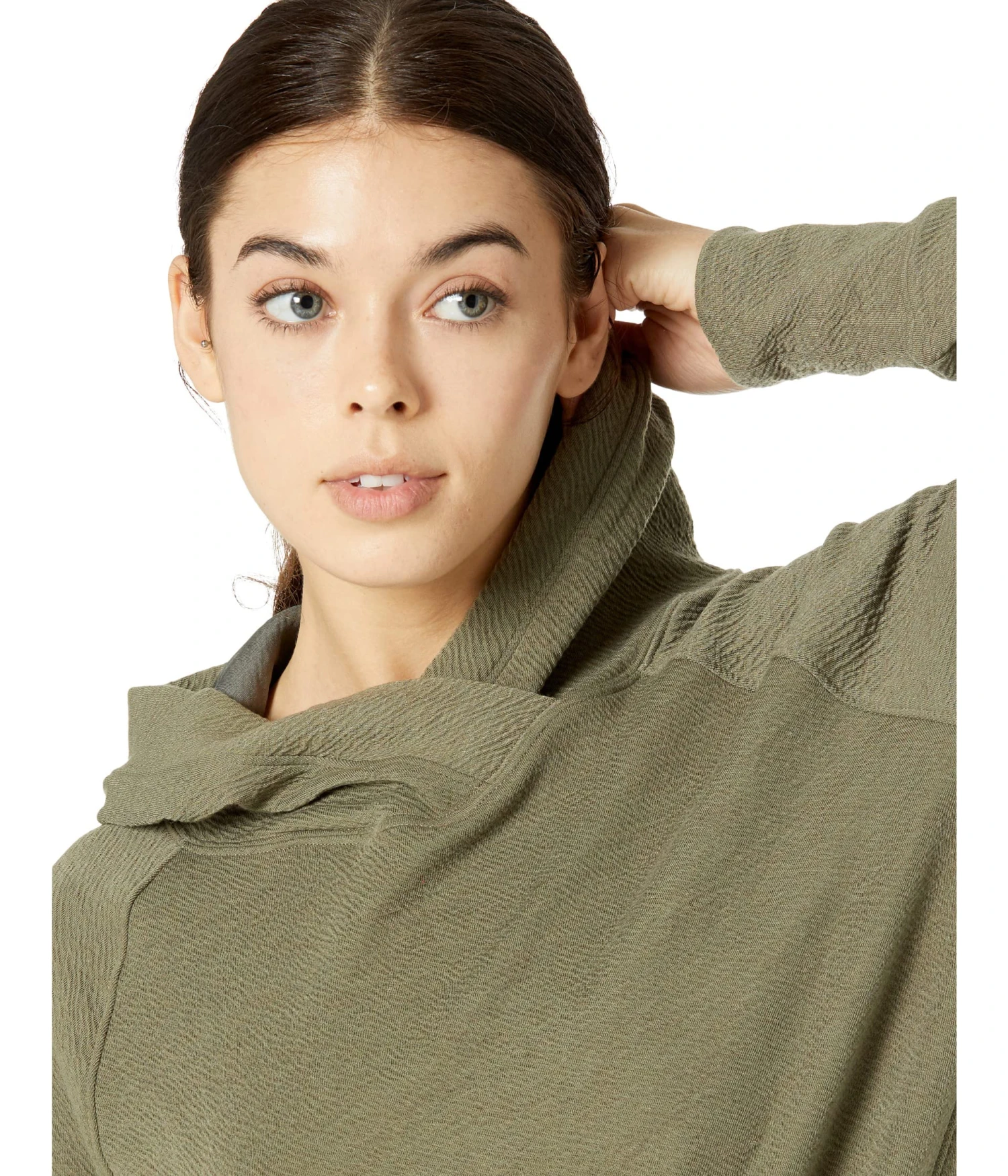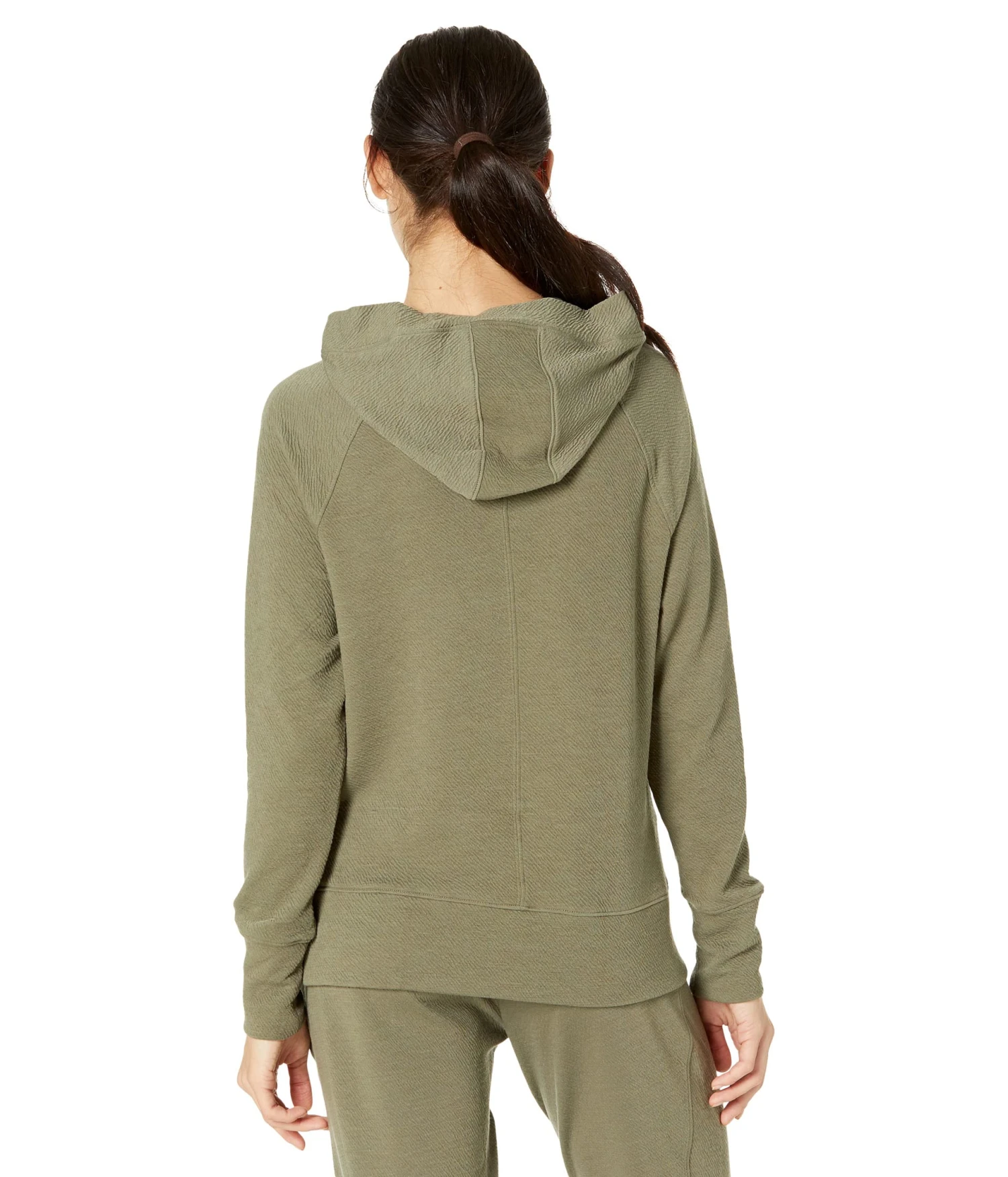 - Features a fitted hoodie, raglan long sleeves for range of movement, and an asymmetrical hemline.