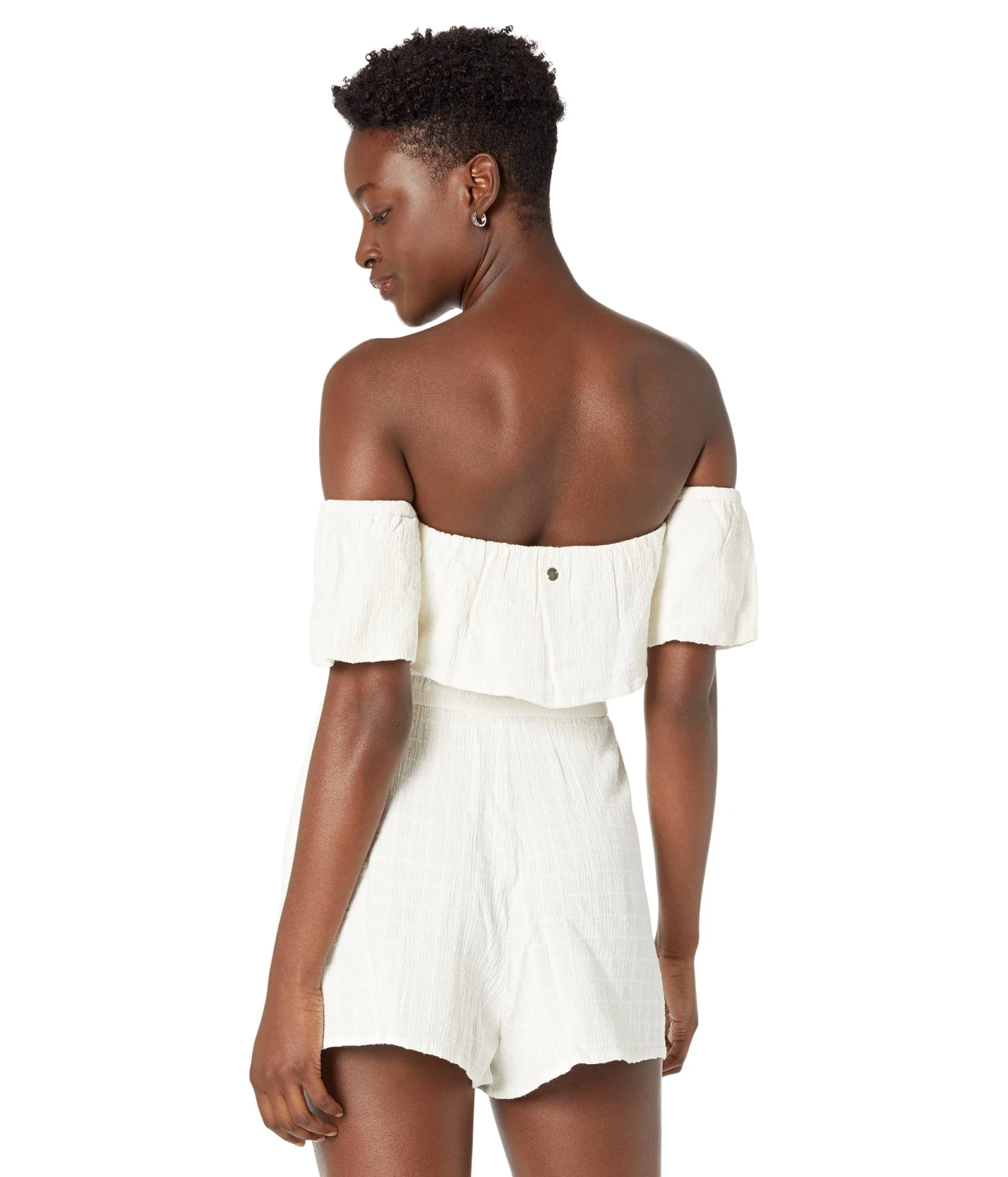 - Off-the-shoulder top with an elasticized waist for a snug fit.