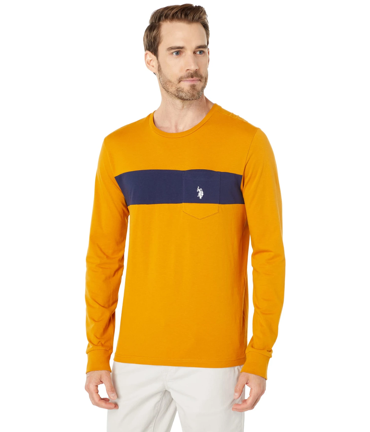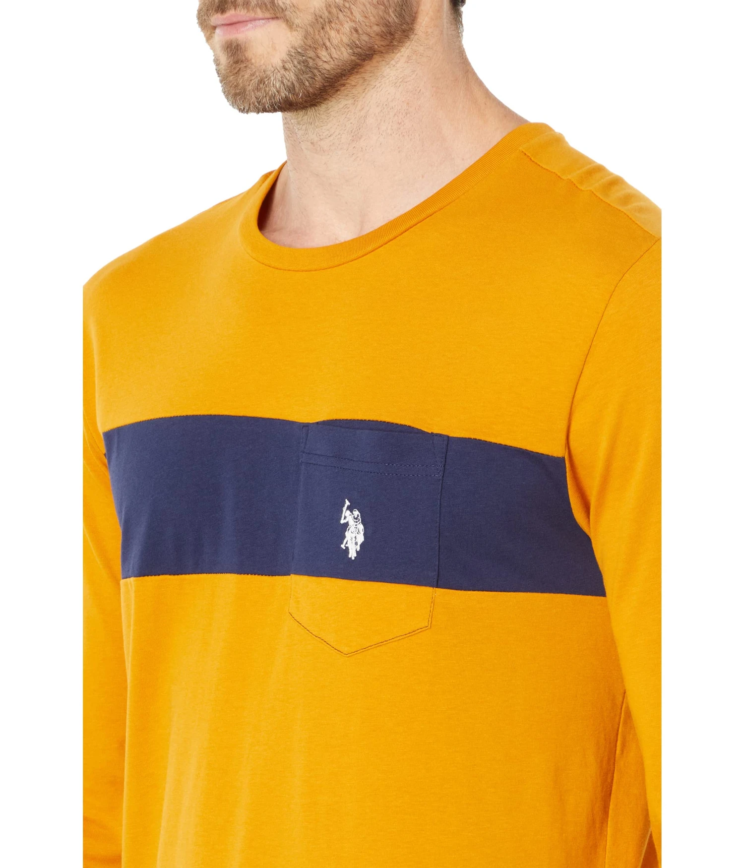 - Crafted for an all day style and comfort, the U.S. POLO ASSN.® Long Sleeve Color-Block Tee with Pocket features a rounded neckline, long sleeves with fitted cuffs, center chest front color-block design, patch pocket on front chest corner, and a straight hemline.